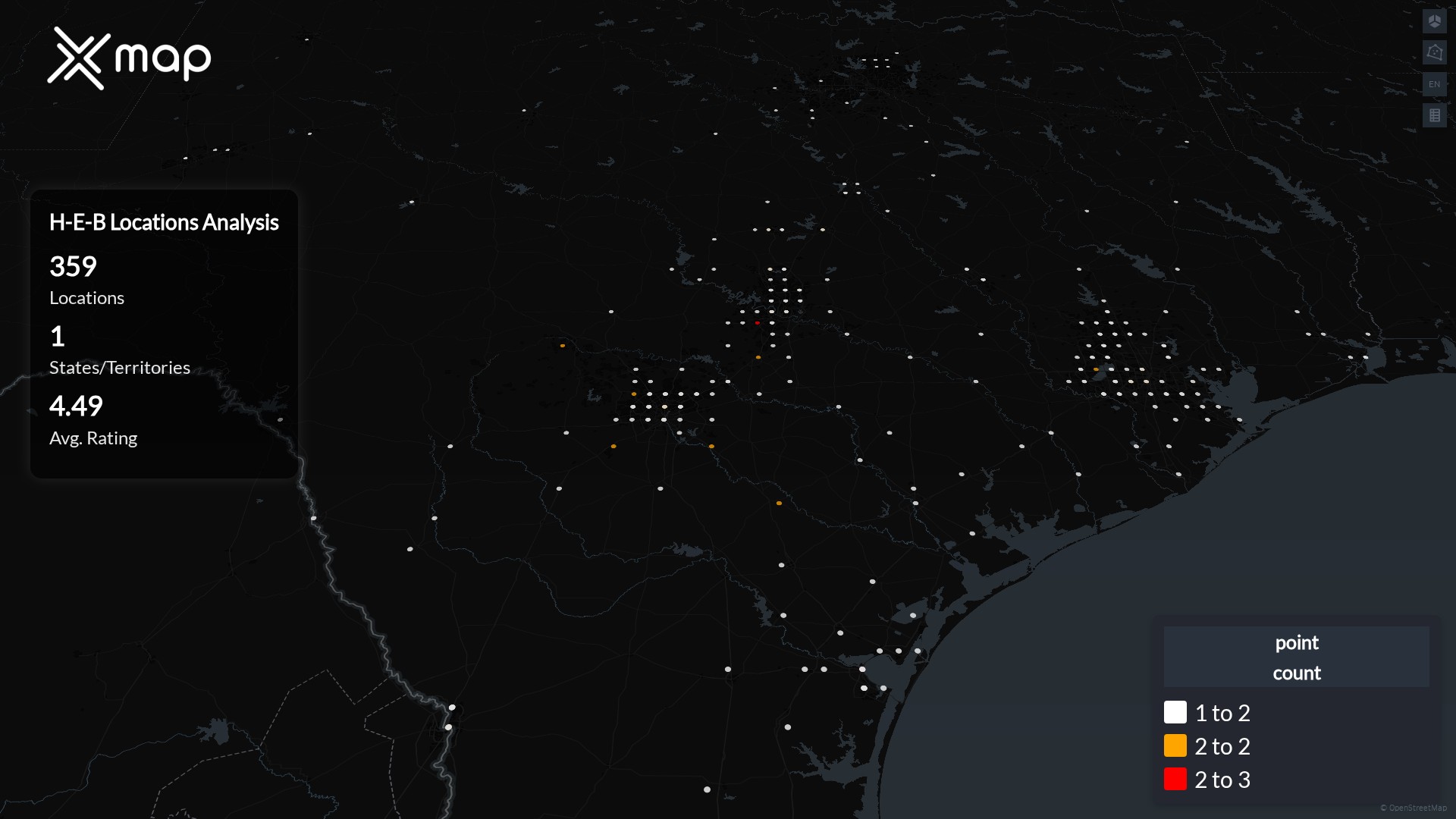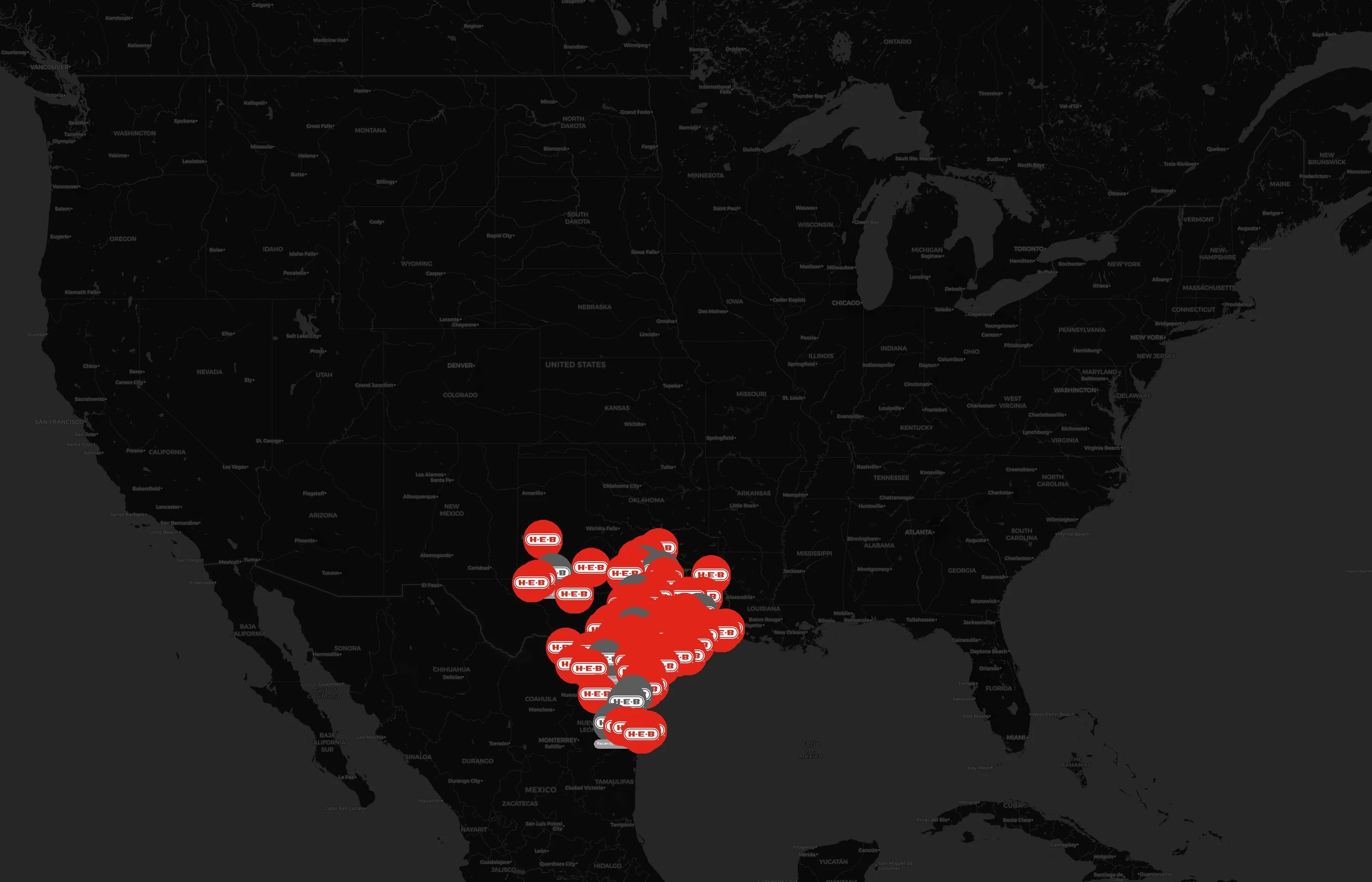 Street-level clusters show corridors where multiple H-E-B locations sit within the same neighborhood indicating strong local presence and coherence. H-E-B operates a total of 359 nationwide.