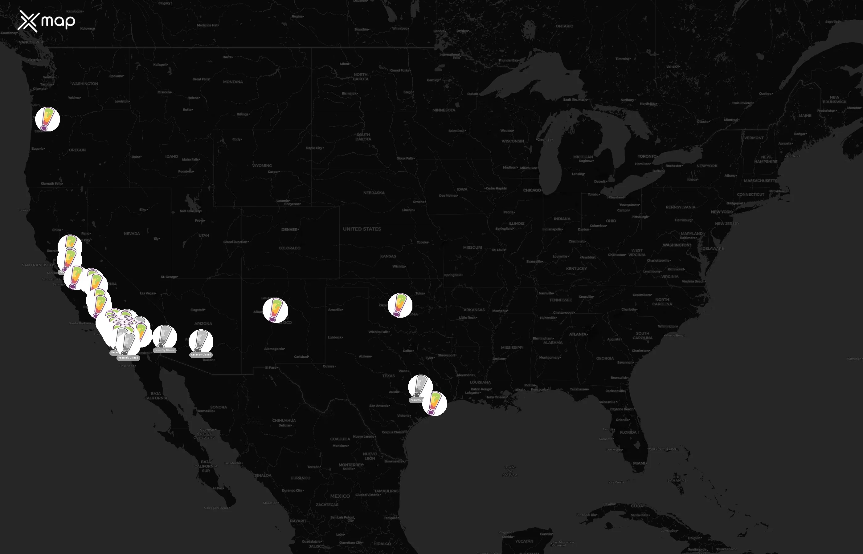 Locations concentrate around major metros such as San Bernardino, Riverside, Orange, Los Angeles, and Fresno. The top 10 cities account for 92.8% of U.S. sites.