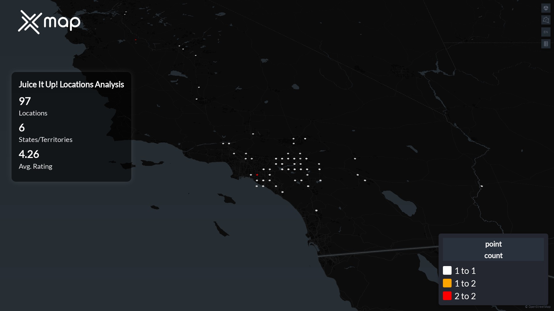 Street-level clusters show corridors where multiple Juice It Up! locations sit within the same neighborhood indicating strong local presence and coherence. Juice It Up! operates a total of 97 nationwide.