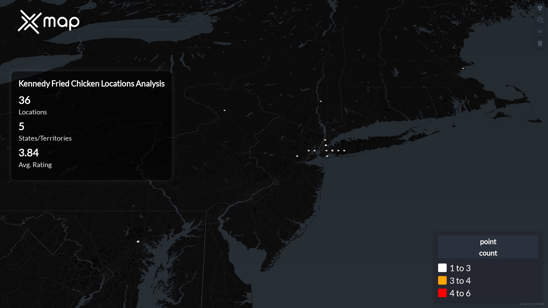 Street-level clusters show corridors where multiple Kennedy Fried Chicken locations sit within the same neighborhood indicating strong local presence and coherence. Kennedy Fried Chicken operates a total of 36 nationwide.