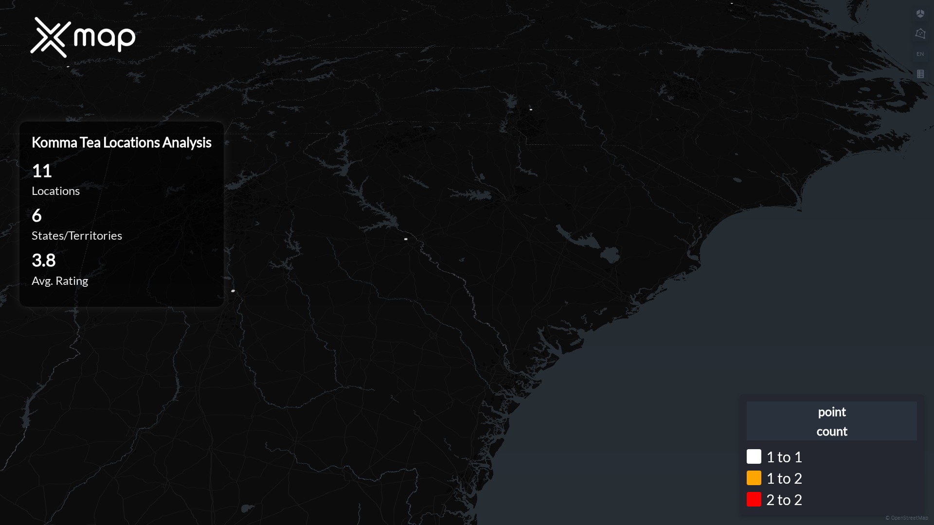 Street-level clusters show corridors where multiple Komma Tea locations sit within the same neighborhood indicating strong local presence and coherence. Komma Tea operates a total of 11 nationwide.