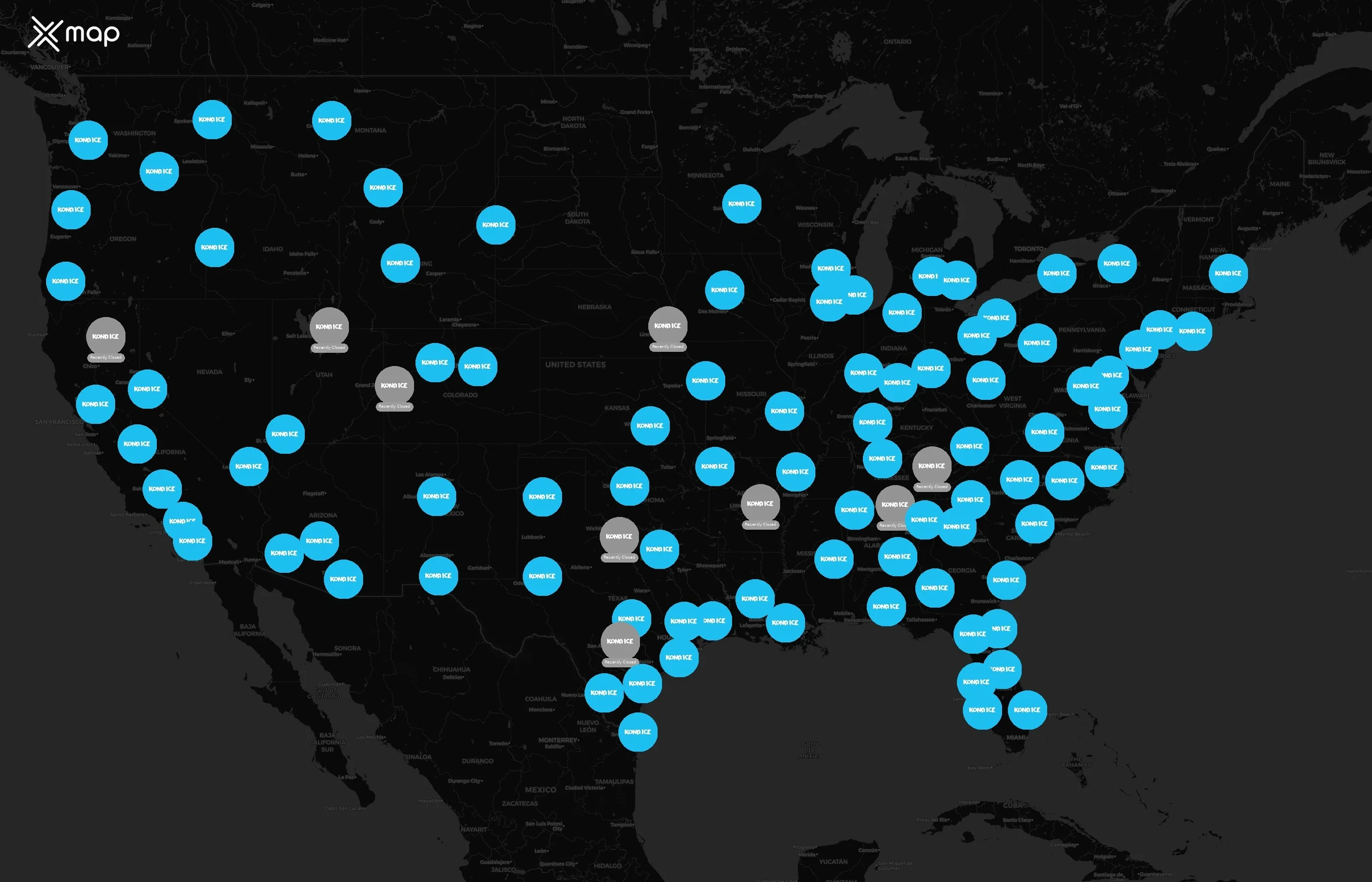 Street-level clusters show corridors where multiple Kona Ice locations sit within the same neighborhood indicating strong local presence and coherence. Kona Ice operates a total of 452 nationwide.