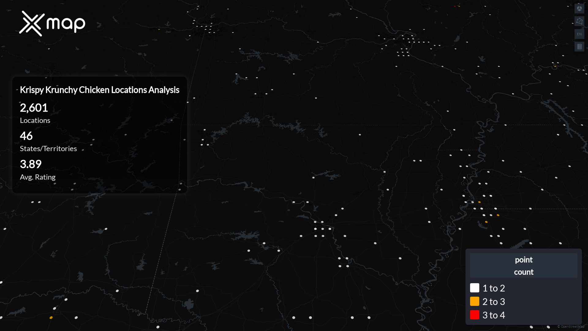 Krispy Krunchy Chicken POI data enables clear measurement of footprint and demand. Analysts can rank states and cities by location count, compare coverage on a per-capita basis, and use traffic scores and review volumes to spot high-performing markets and under-served pockets. The result is an objective view of saturation, growth opportunities, and performance outliers.
