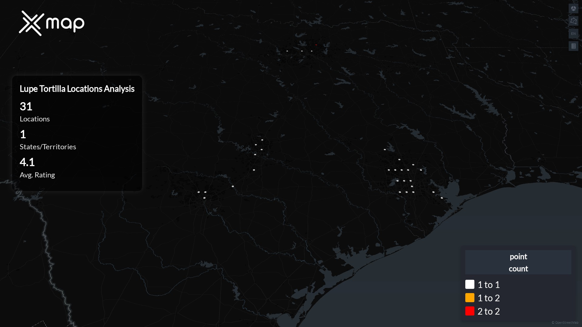 As of December 01, 2025, Lupe Tortilla operates 31 locations across the United States of America. Texas hosts the largest share with 31 locations, representing about 100.0% of the national total.