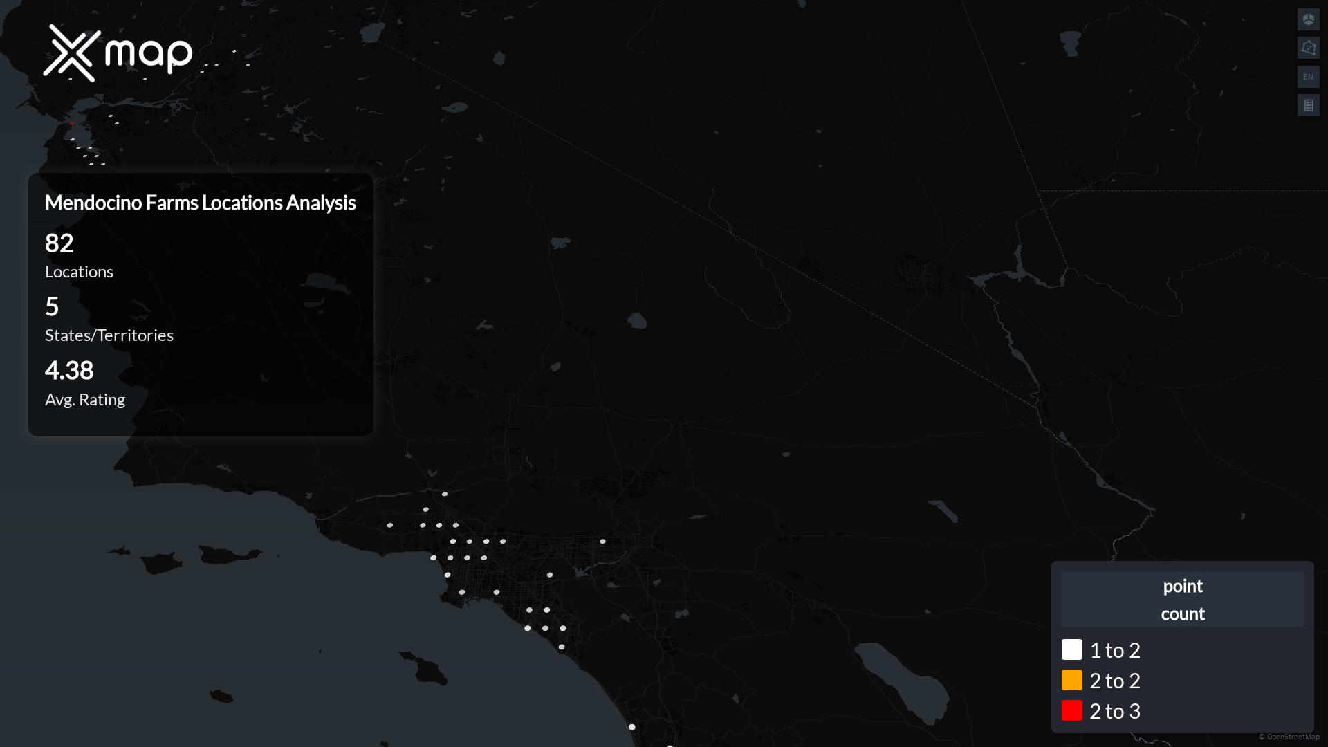 Street-level clusters show corridors where multiple Mendocino Farms locations sit within the same neighborhood indicating strong local presence and coherence. Mendocino Farms operates a total of 82 nationwide.