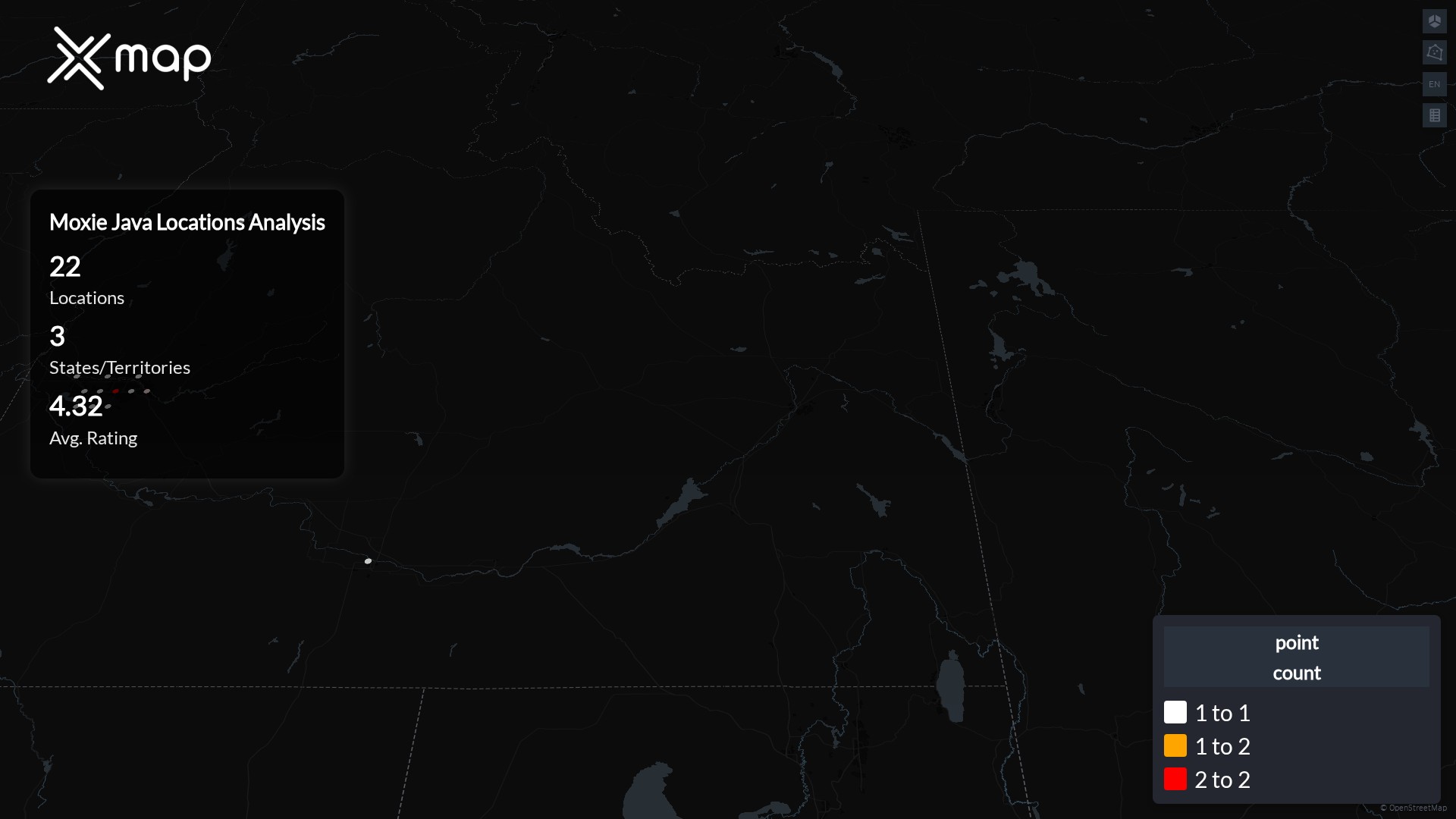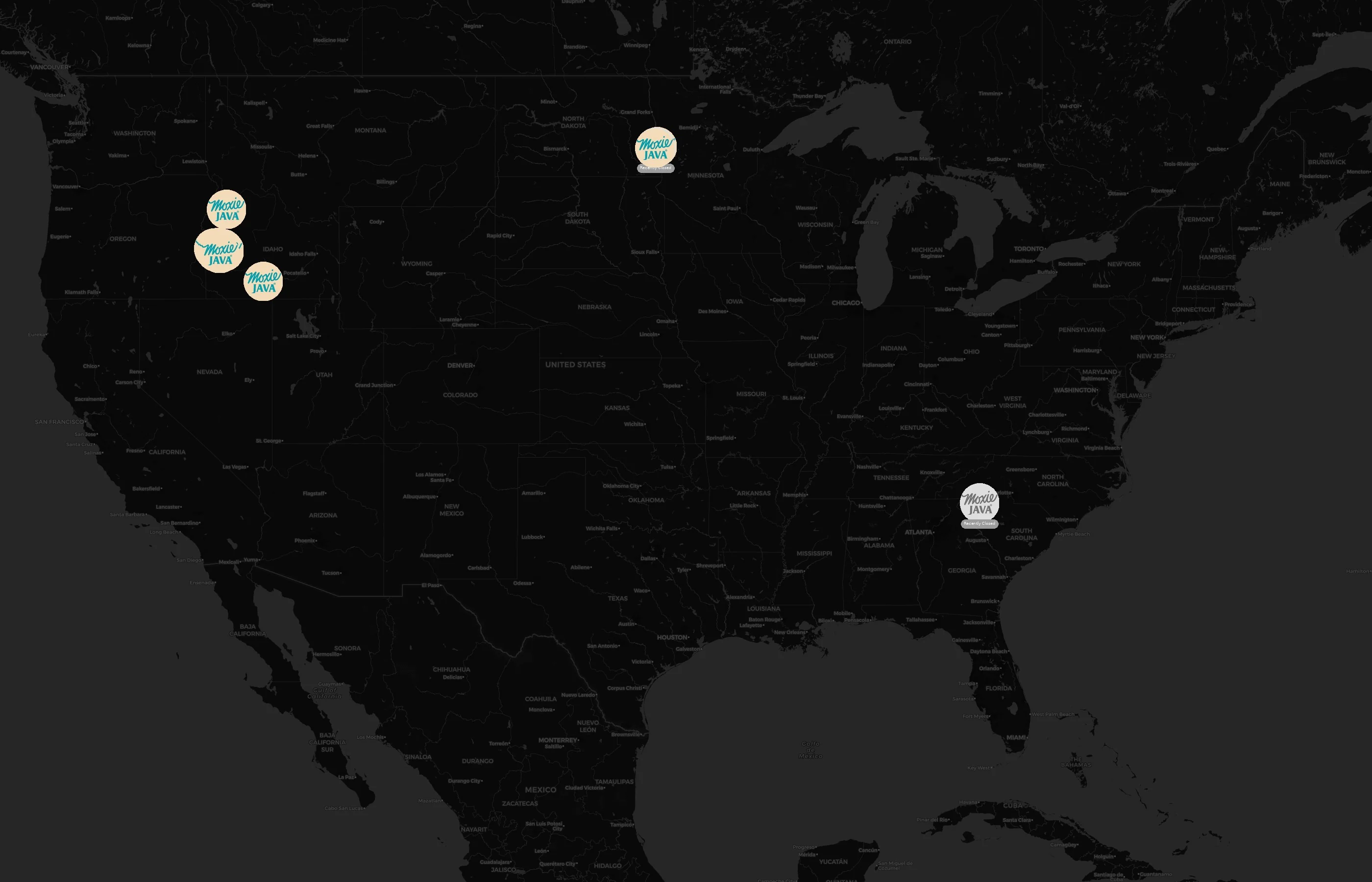 Street-level clusters show corridors where multiple Moxie Java locations sit within the same neighborhood indicating strong local presence and coherence. Moxie Java operates a total of 22 nationwide.