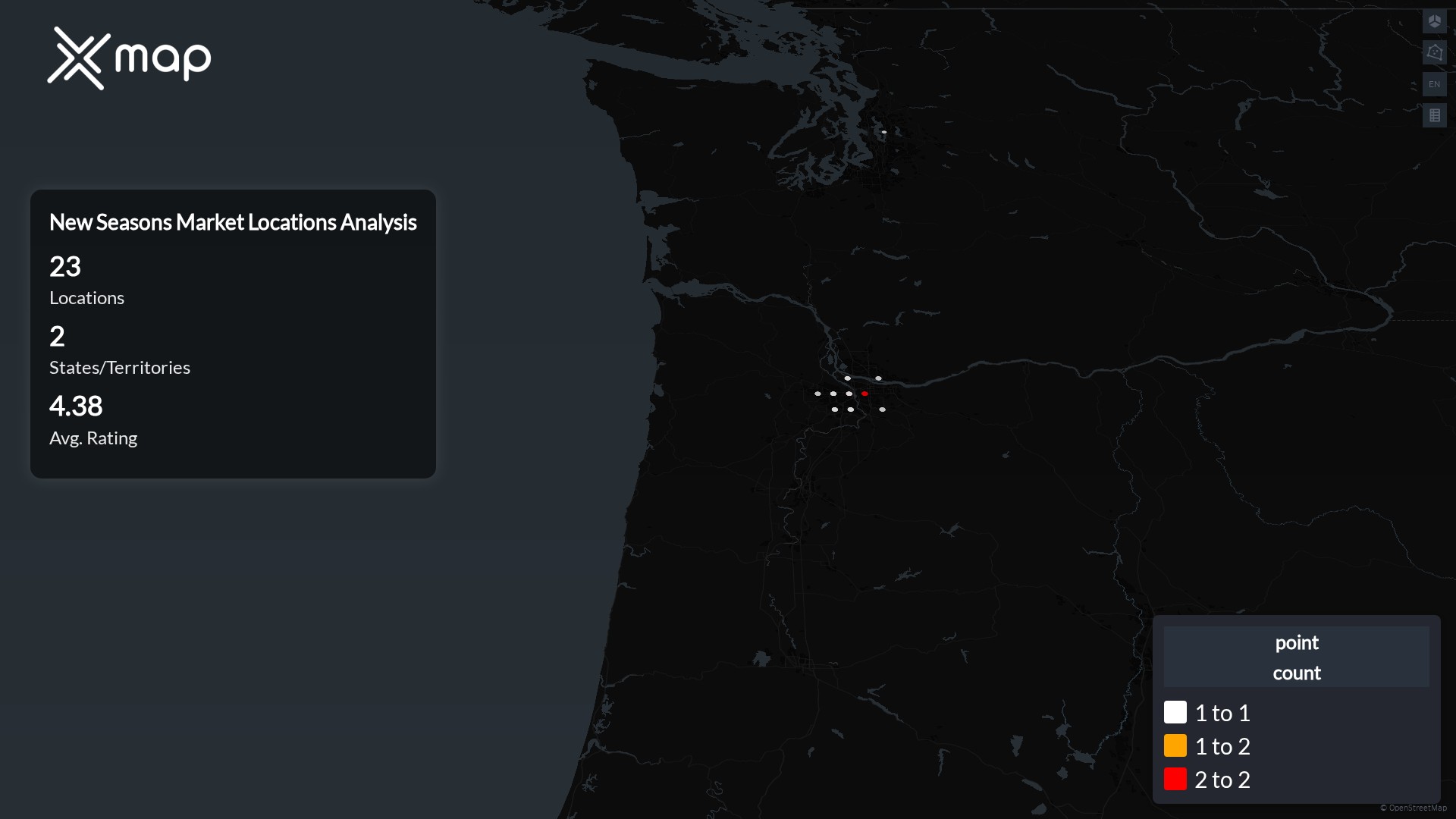 Street-level clusters show corridors where multiple New Seasons Market locations sit within the same neighborhood indicating strong local presence and coherence. New Seasons Market operates a total of 23 nationwide.