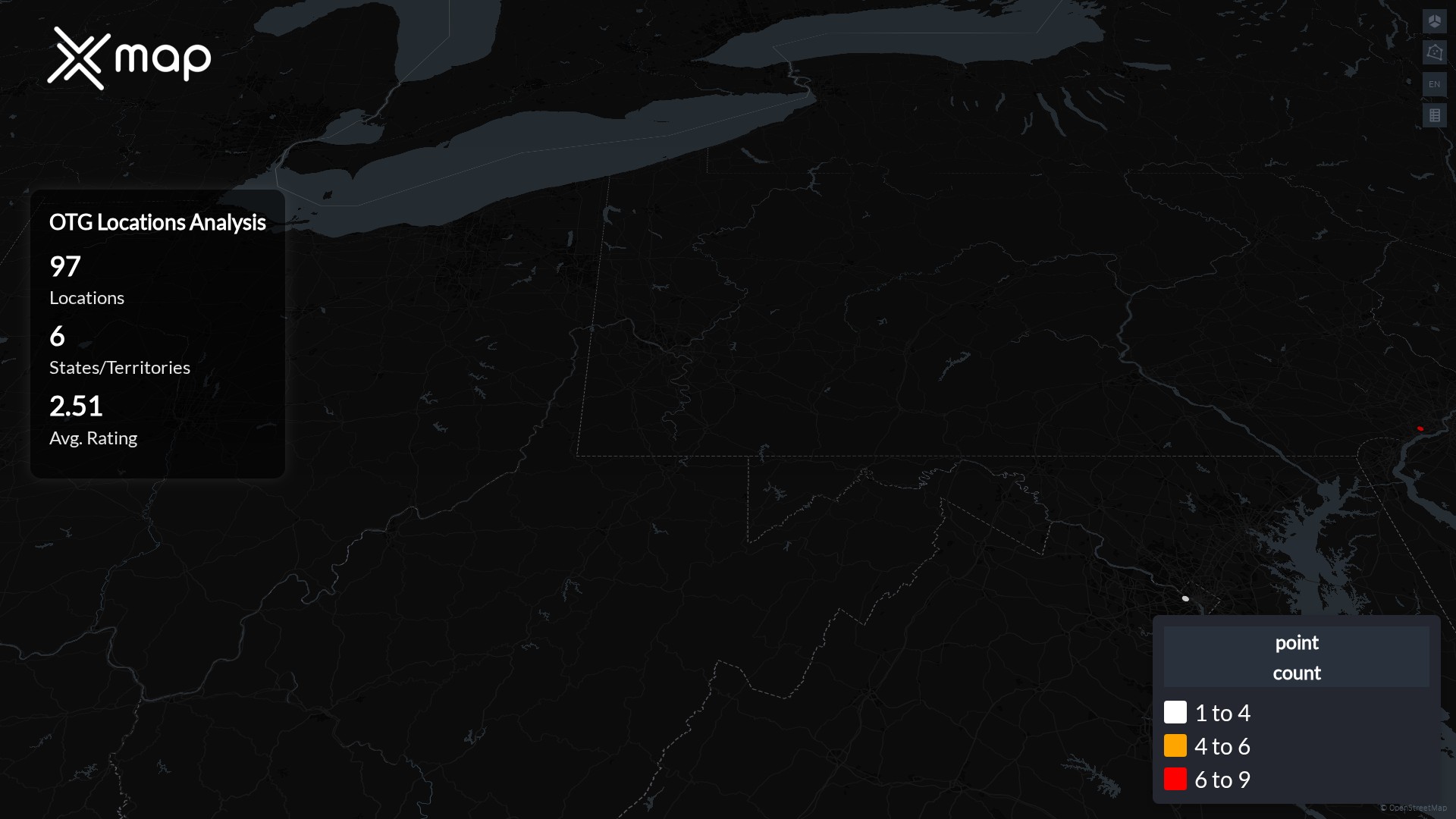 Street-level clusters show corridors where multiple OTG locations sit within the same neighborhood indicating strong local presence and coherence. OTG operates a total of 97 nationwide.