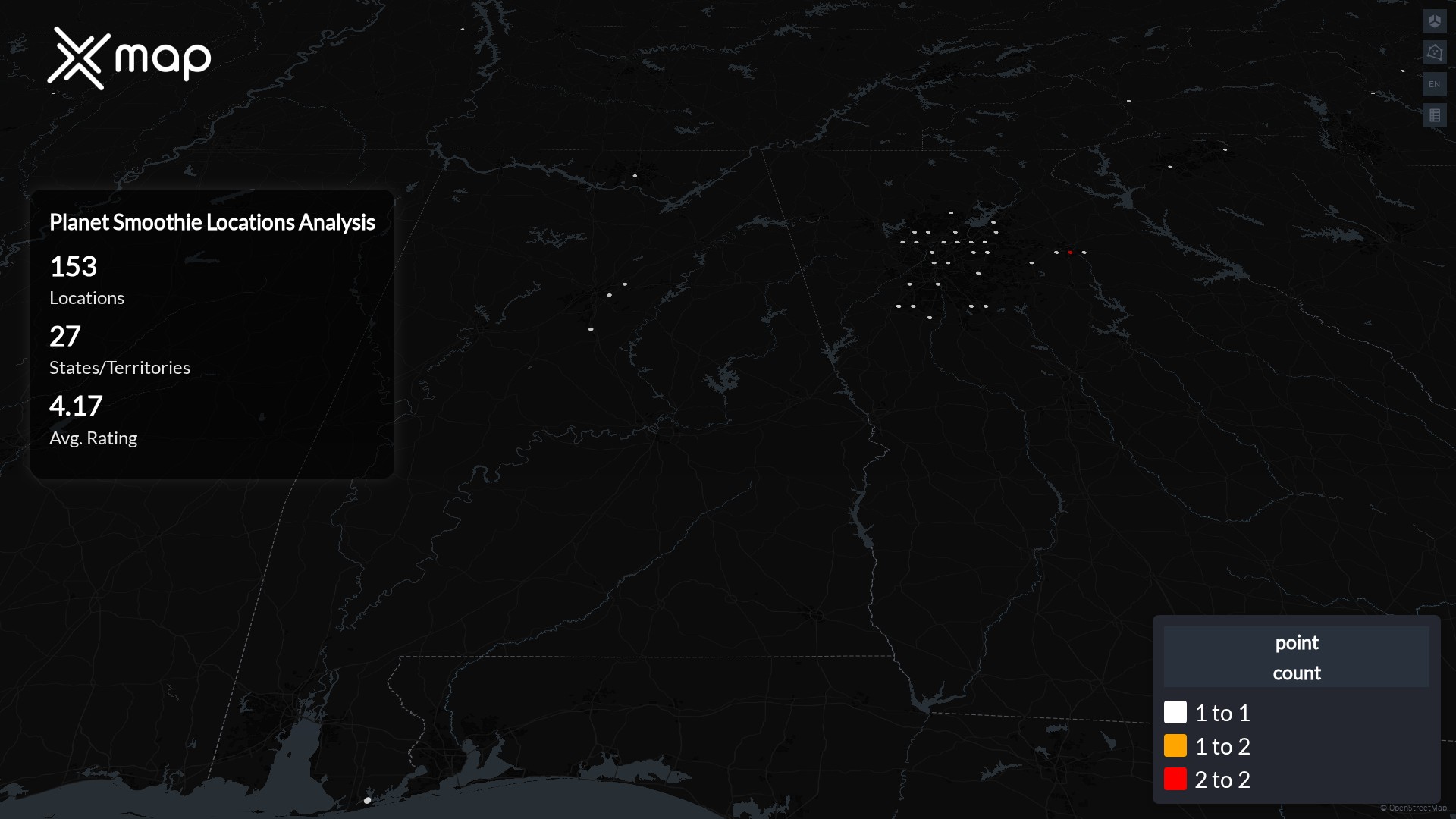 Planet Smoothie POI data enables clear measurement of footprint and demand. Analysts can rank states and cities by location count, compare coverage on a per-capita basis, and use traffic scores and review volumes to spot high-performing markets and under-served pockets. The result is an objective view of saturation, growth opportunities, and performance outliers.