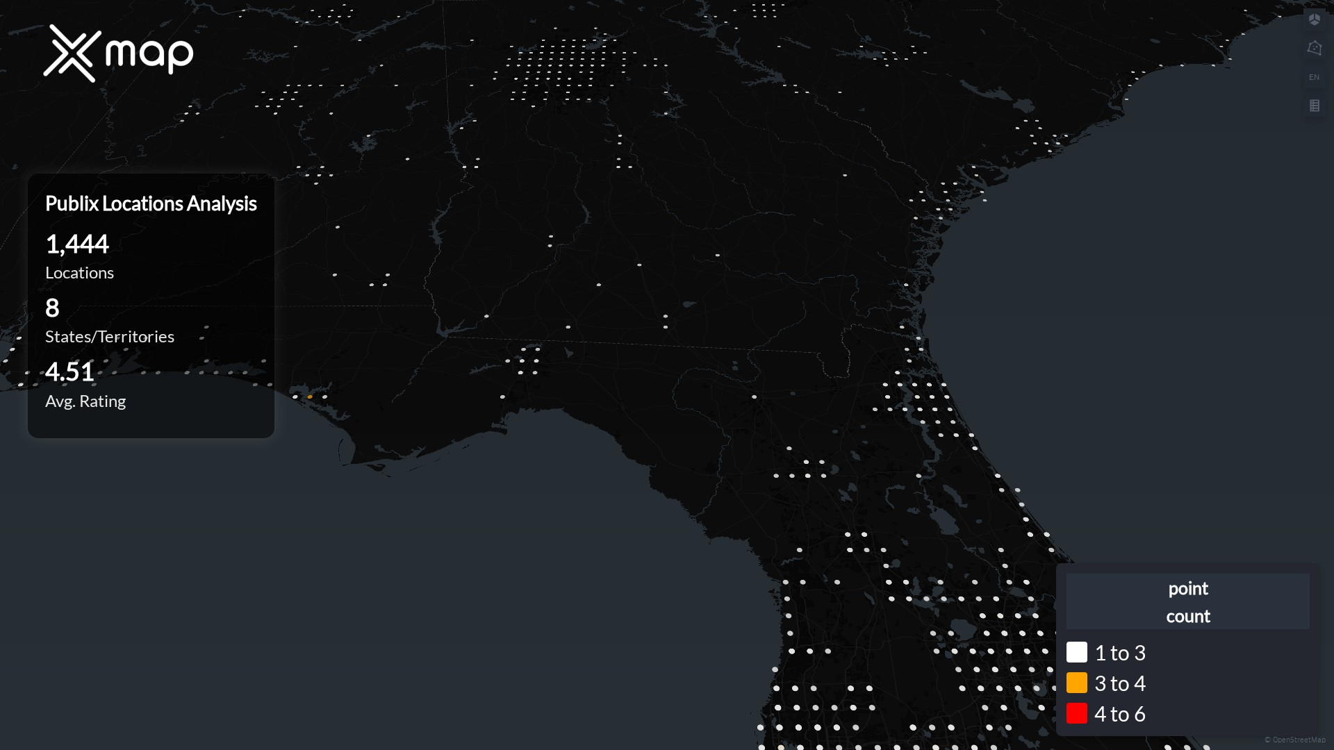 Street-level clusters show corridors where multiple Publix locations sit within the same neighborhood indicating strong local presence and coherence. Publix operates a total of 1444 nationwide.