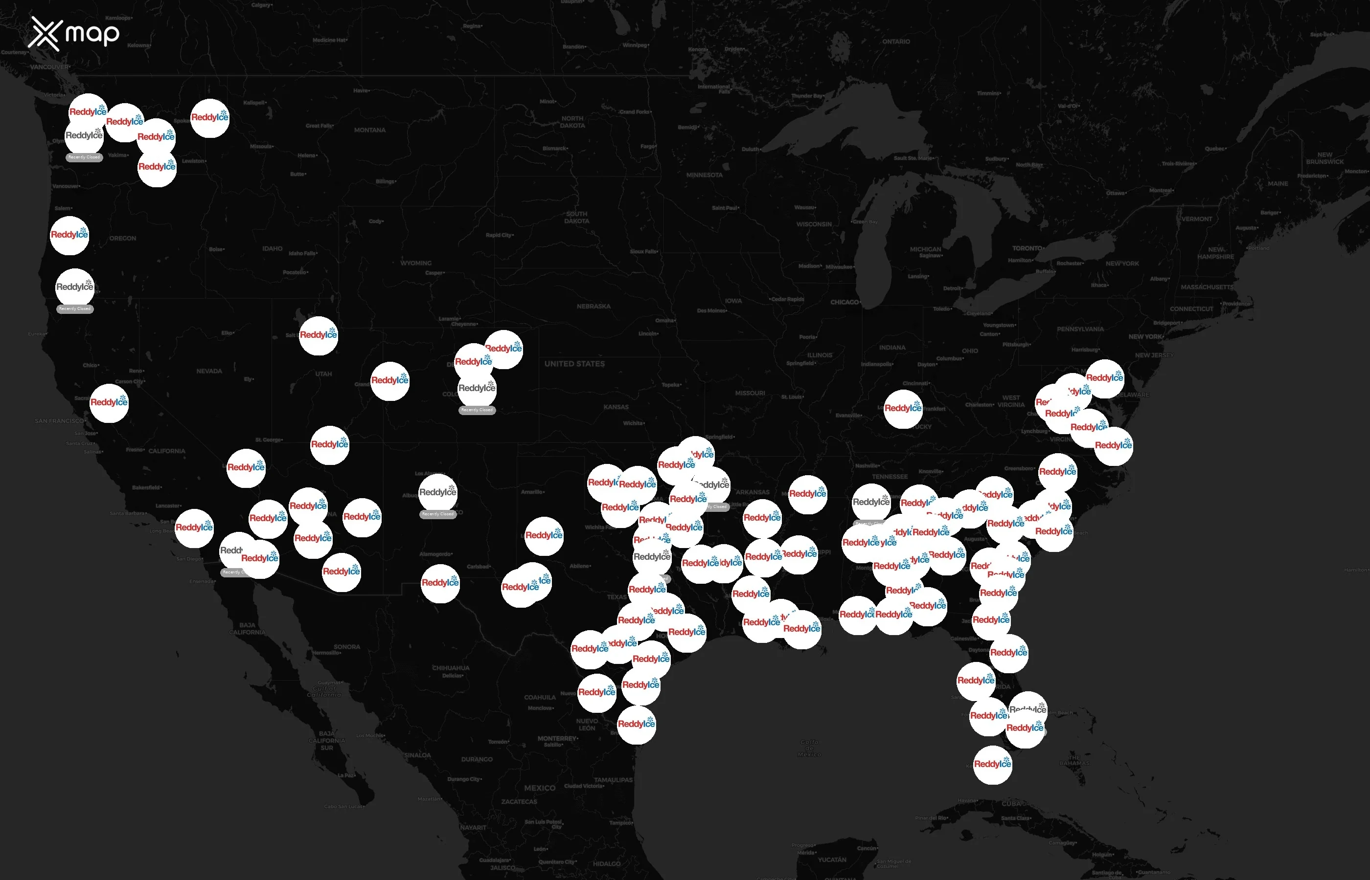 Street-level clusters show corridors where multiple Reddy Ice locations sit within the same neighborhood indicating strong local presence and coherence. Reddy Ice operates a total of 132 nationwide.
