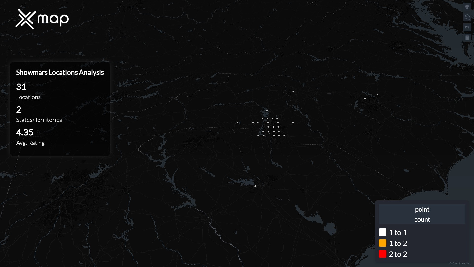 Street-level clusters show corridors where multiple Showmars locations sit within the same neighborhood indicating strong local presence and coherence. Showmars operates a total of 31 nationwide.