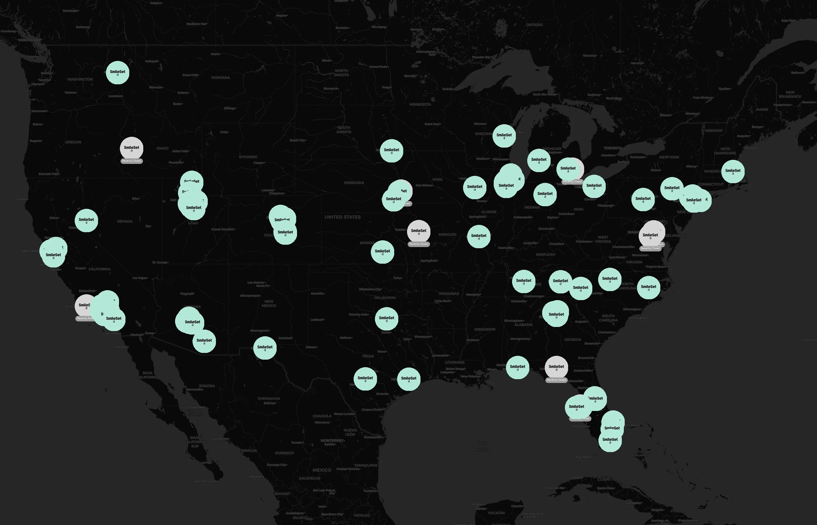 Street-level clusters show corridors where multiple SmileDirectClub locations sit within the same neighborhood indicating strong local presence and coherence. SmileDirectClub operates a total of 90 nationwide.