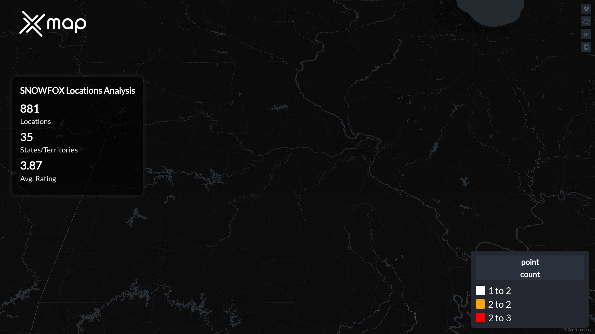 Street-level clusters show corridors where multiple SNOWFOX locations sit within the same neighborhood indicating strong local presence and coherence. SNOWFOX operates a total of 881 nationwide.