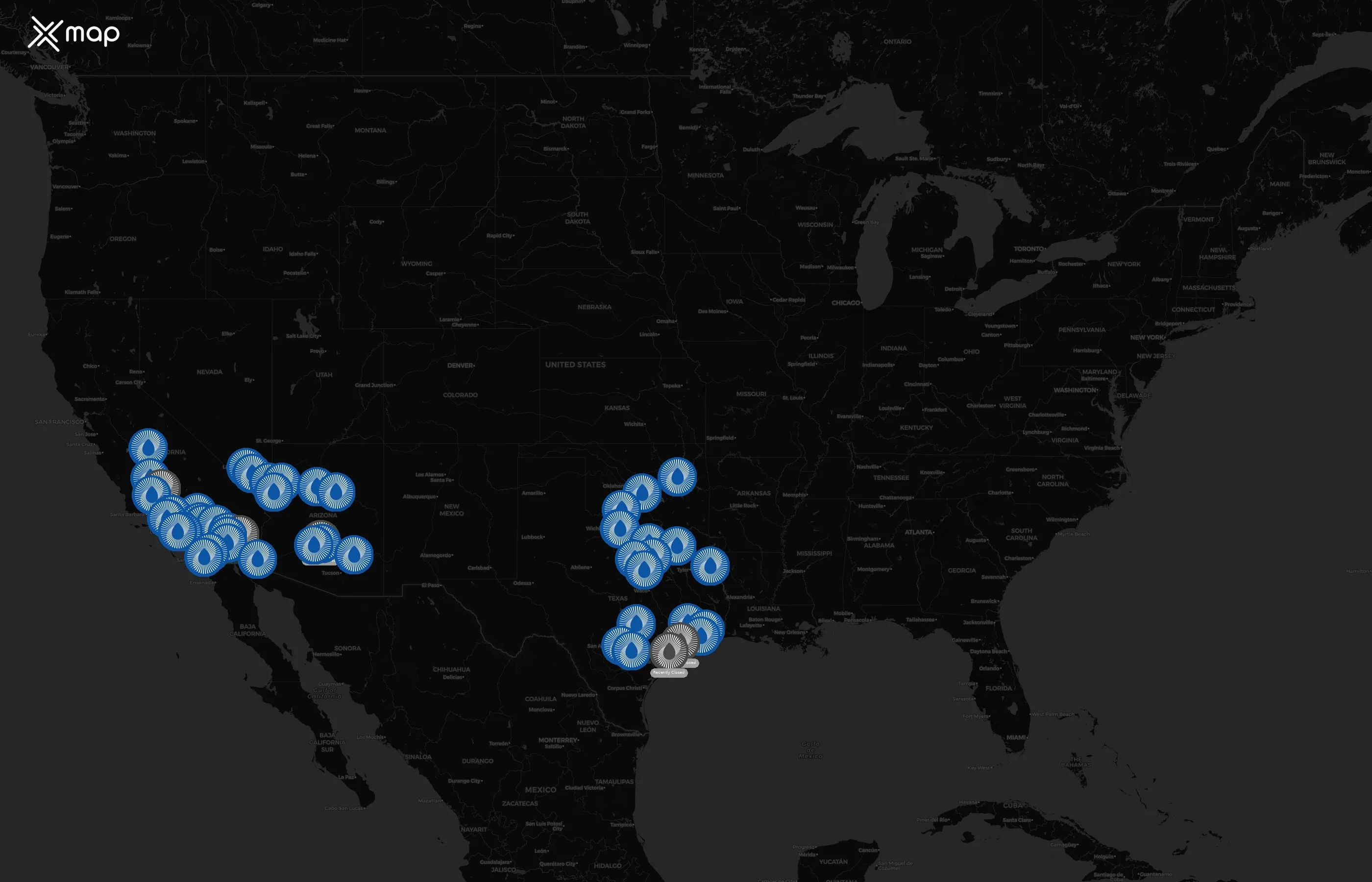 Locations concentrate around major metros such as San Bernardino, Los Angeles, Coconino, Kern, and Maricopa. The top 10 cities account for 54.7% of U.S. sites.