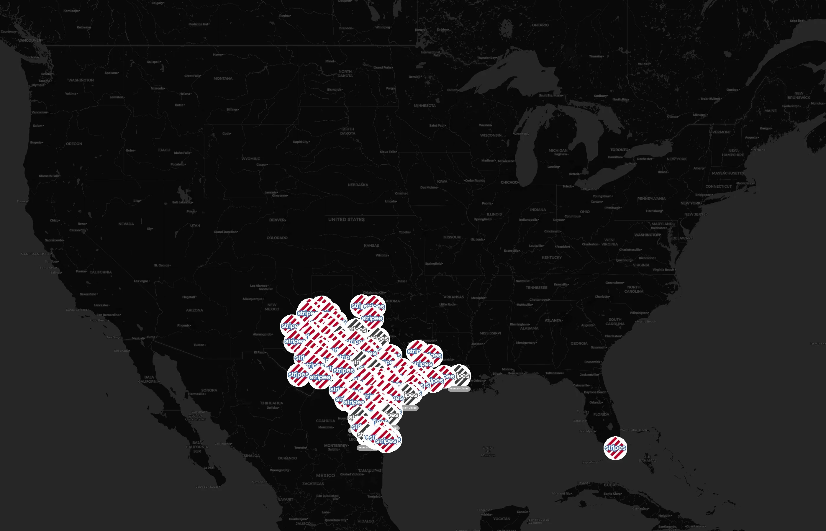 Street-level clusters show corridors where multiple Stripes locations sit within the same neighborhood indicating strong local presence and coherence. Stripes operates a total of 694 nationwide.