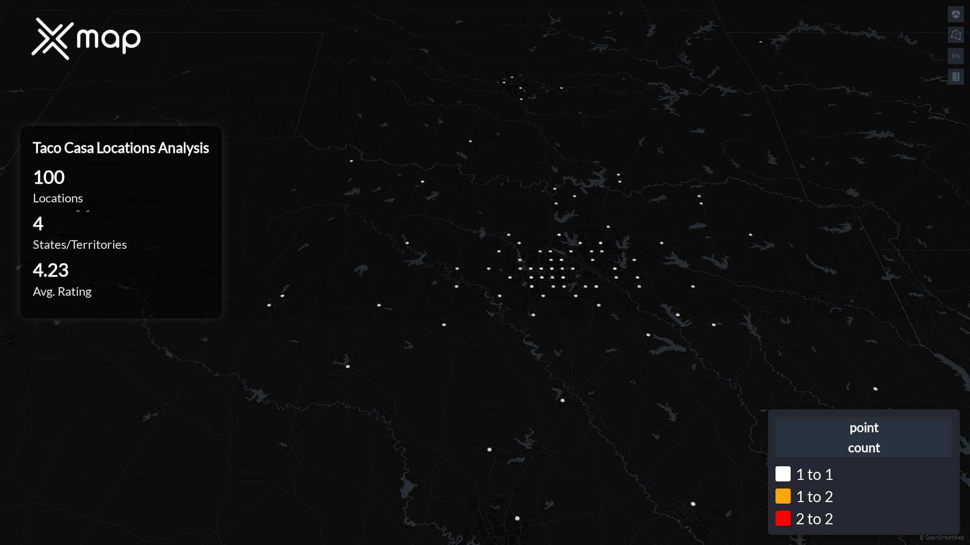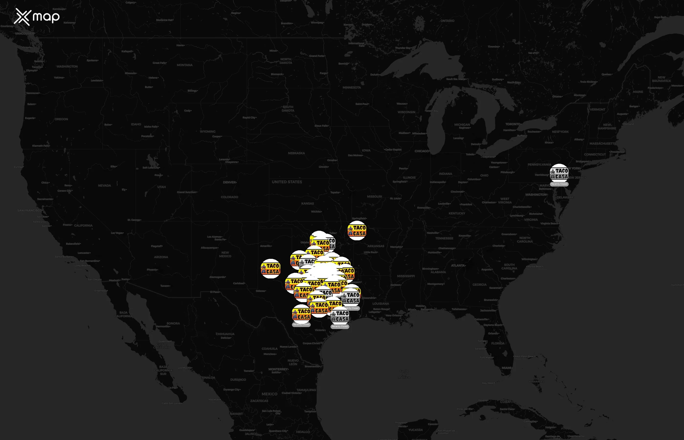 Street-level clusters show corridors where multiple Taco Casa locations sit within the same neighborhood indicating strong local presence and coherence. Taco Casa operates a total of 100 nationwide.