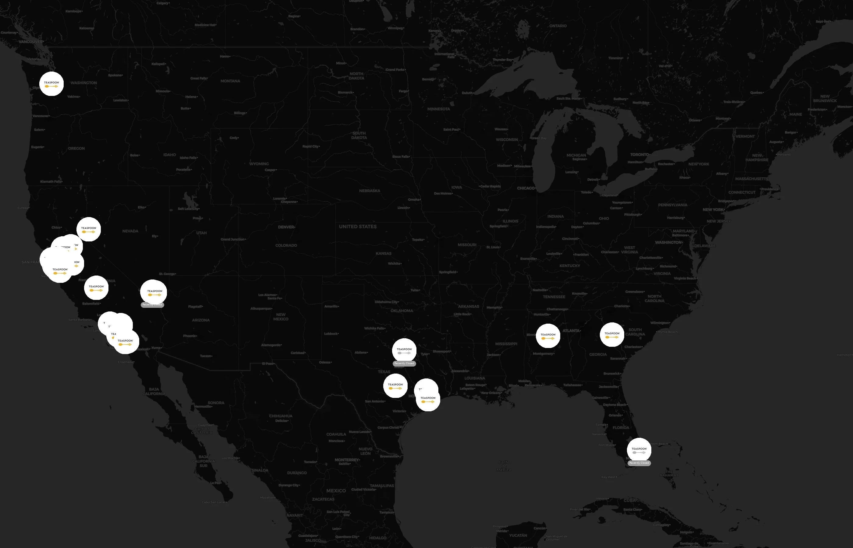 Street-level clusters show corridors where multiple Teaspoon locations sit within the same neighborhood indicating strong local presence and coherence. Teaspoon operates a total of 36 nationwide.