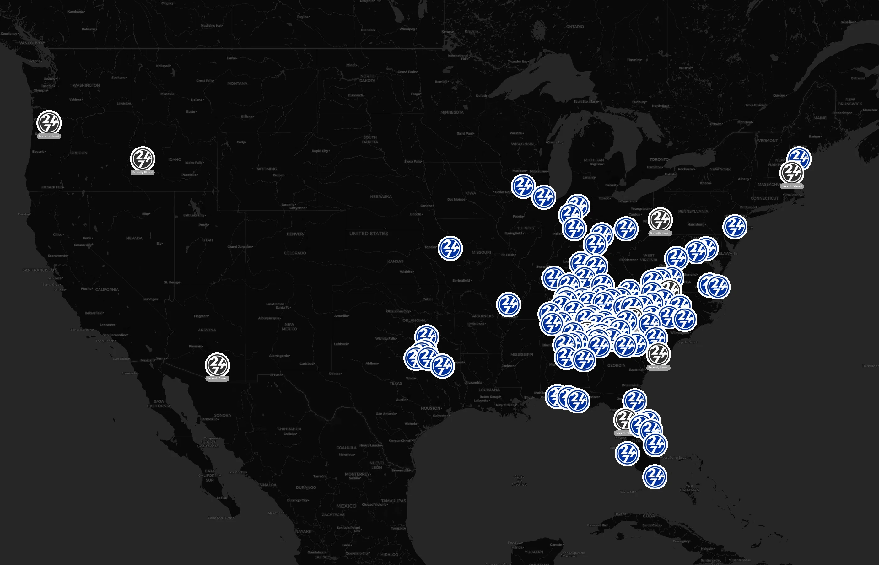 Locations concentrate around major metros such as Cobb, Fulton, Collin, Hamilton, and Knox. The top 10 cities account for 18.8% of U.S. sites.